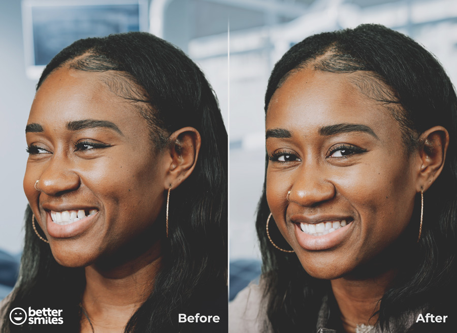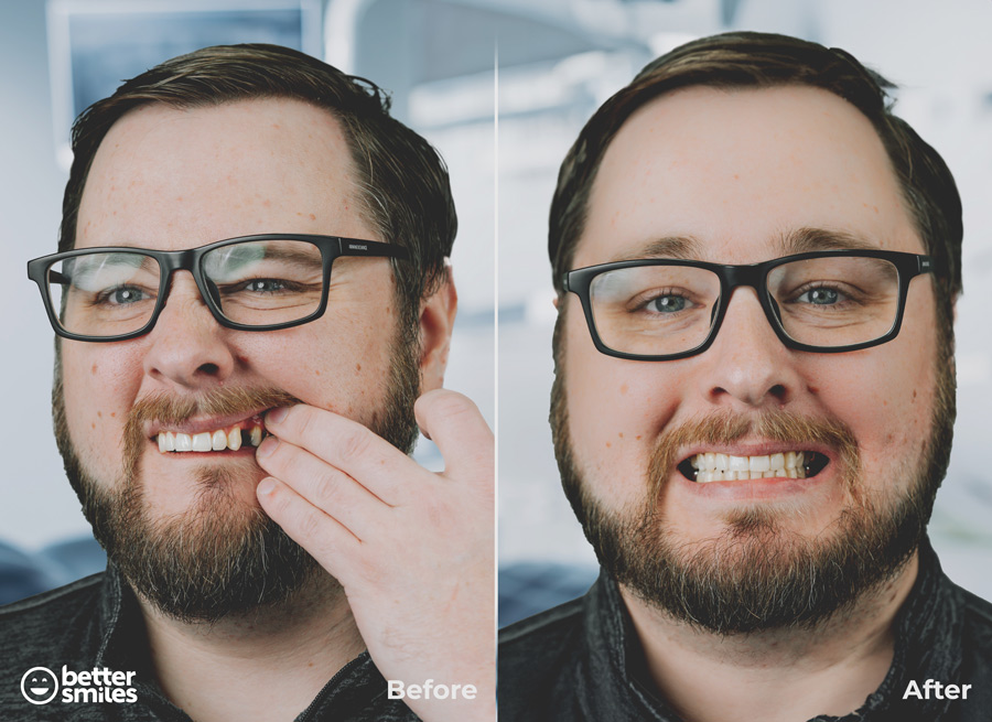 A tooth shade match card is included in your at-home impression kit. Hold this card next to your teeth and take a selfie and then upload it to bettersmiles.com/upload. Our licensed dentist partner will review your photos and select the appropriate tooth shade from over a dozen possible options. We will select your base shade from several options but don’t worry, the base shade is translucent which allows your natural gum shade to show through which will help make it less visible.