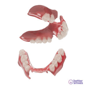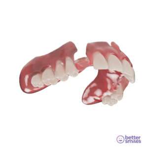 BetterSmiles tooth replacement appliances are made of a flexible pink base and plastic teeth. The base fits around existing teeth to hold it in place. It looks natural because the pink base blends with the color of your gums. Dentists have prescribed these types of appliances to millions of patients for more than 50 years. BetterSmiles appliances are made to the same standards as you would receive in a dental office, but now you can get them from the comfort of your home.